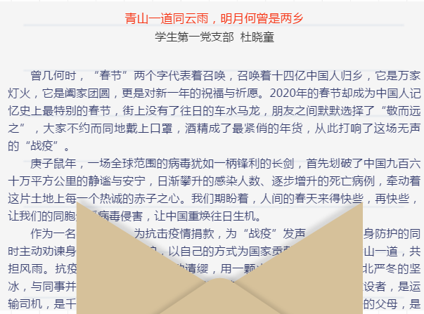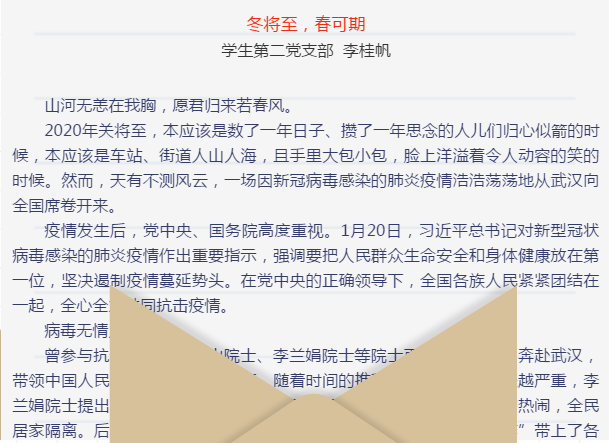 庚子鼠年,疫情来袭,全民抗“疫”。在这场没有硝烟的战争中我们清楚地看到许多优秀党员敢于担当作为的底色。一个支部就是一个战斗堡垒,一名党员就是一面旗帜,为进一步激发我院学生打赢这场疫情防控阻击战的信心和决心,表达对抗“疫”英雄的敬意,总结我们在这场战“疫”中的收获与成长,展现中华民族在复兴之路上不屈不挠、愈战愈勇的民族精神。太阳集团网tyc9728学生第一、第二党支部举办了“党员旗帜高扬,凝聚战疫力量”主题征文活动。