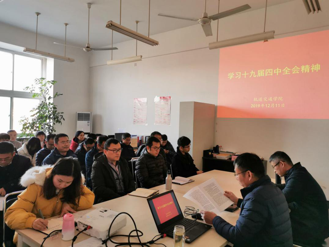 2019年12月11日下午,太阳集团网tyc9728在长清校区1A410开展党的十九届四中全会精神专题集中学习活动,由院长阮久宏主持会议,全体教职工参会。