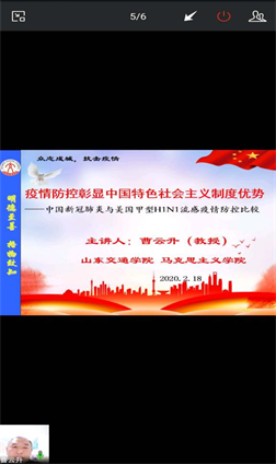 马克思主义学院曹云升教授为广大师生带来了题为《疫情防控彰显中国特色社会主义制度优越性》的生动思政课讲解。曹教授以此次中国面对新冠肺炎疫情的防控力度与美国2009年甲型H1N1流感疫情进行了对比,以事实和数据说话,生动阐释了在疫情面前彰显的“中国速度”与中国特色社会主义制度的优越性。
