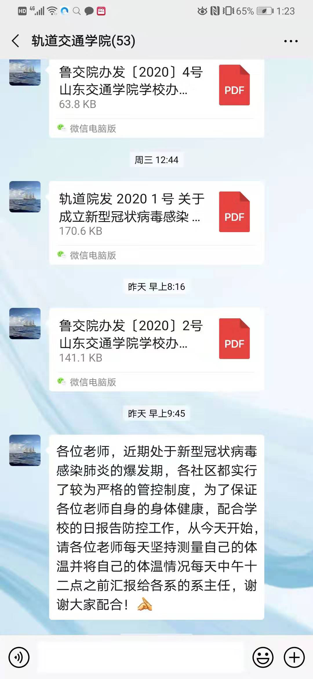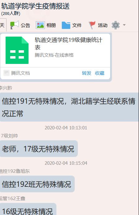学院按学校党委相关要求,以微信群、QQ群等网络平台畅通信息渠道,做好信息的上传下达工作以及对各年级学生的疫情情况排查工作。