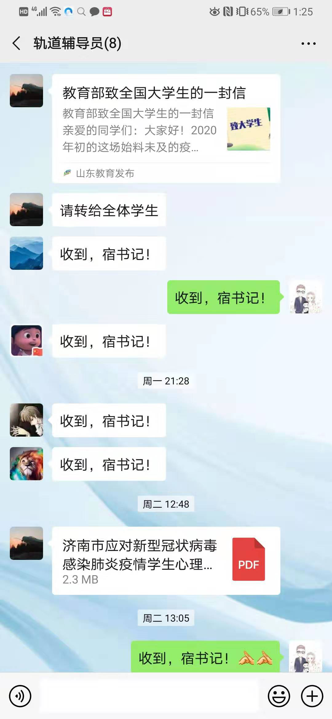 做好特殊时期学生心理疏导工作。及时向学生传达《济南市应对新型冠状病毒感染肺炎疫情学生心理防护指导手册》、《做自己的诊疗师!音乐自我疗愈教学版》等普及心理防护知识。针对湖北籍学生等重点区域、重点学生进行学生心理动态重点关注,配合学校易班有关活动要求进行湖北籍学生“我在湖北挺好的”微视频录制活动,引导学生以健康心态,科学防疫。