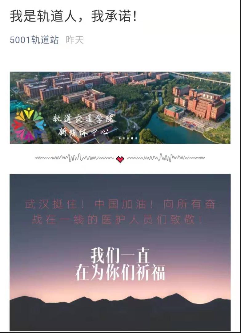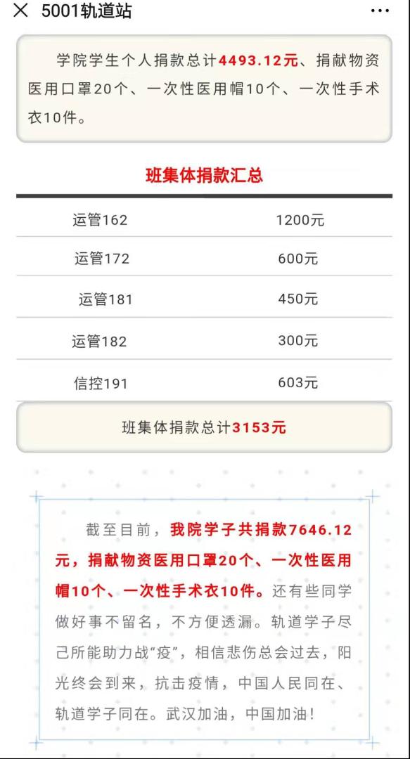 积极组织学生开展“战疫·轨道人在行动”系列活动。学院班级及个人自发组织进行爱心捐款捐物活动,截止目前,我院学生以班级、个人等名义累计捐款7646.12元,捐赠医用口罩20个、一次性医用帽10个、一次性手术衣10件。