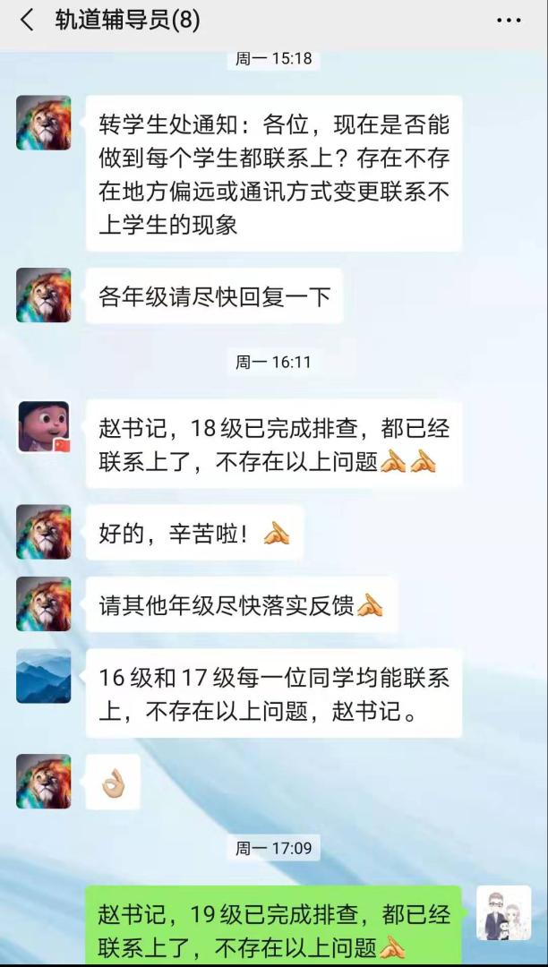 各年级辅导员保持每天与学生的密切沟通与联系,做到“日报告、零报告”,第一时间掌控学生疫情信息动态并上报学院和学校。