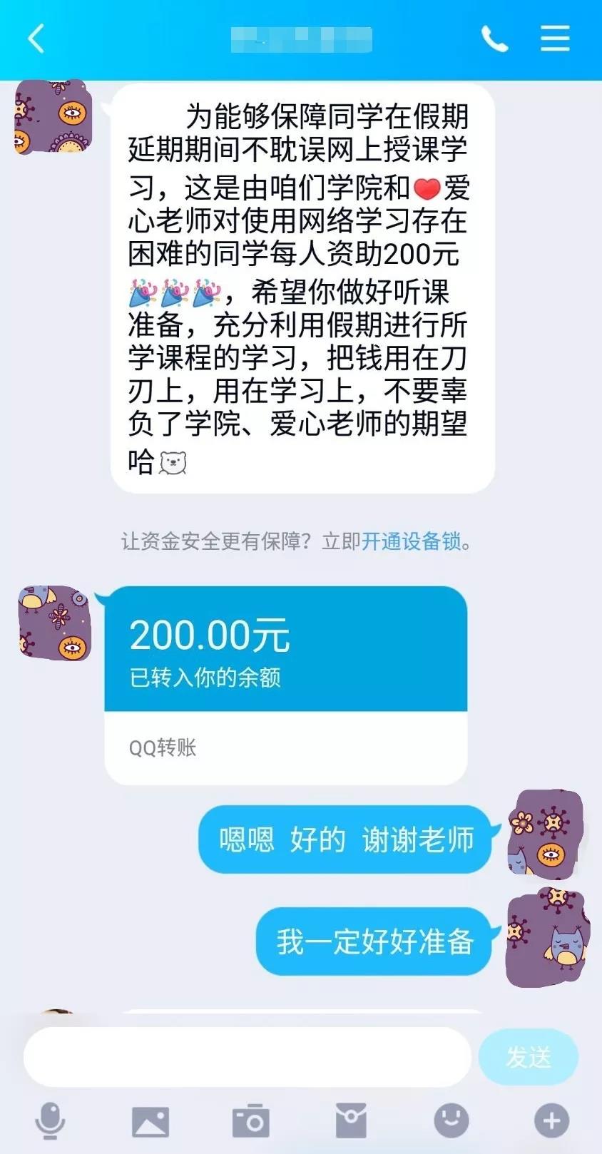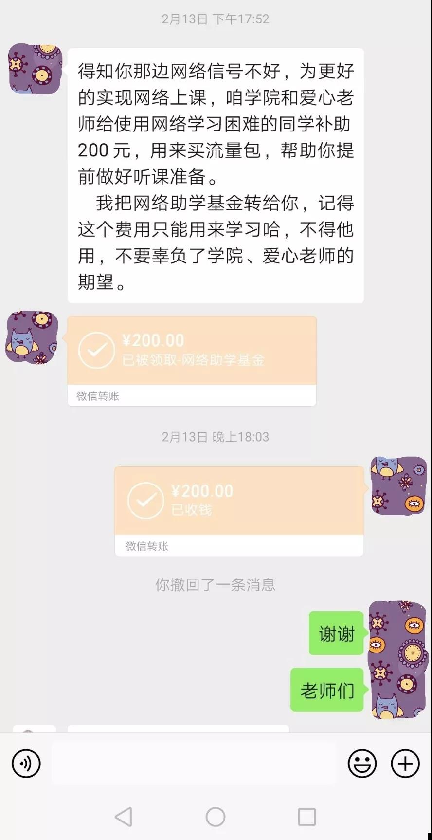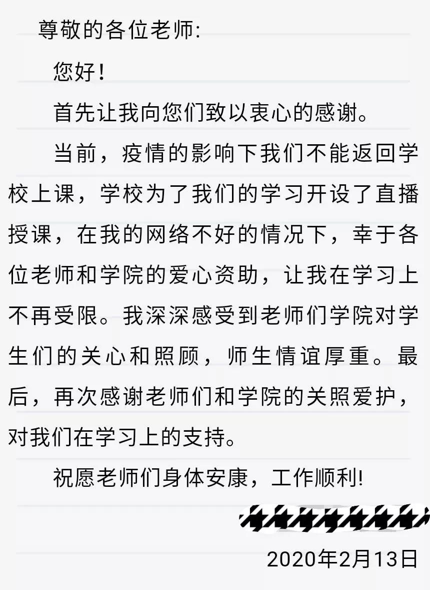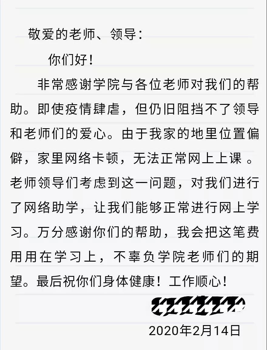 通过网络助学基金的设立,保障了困难学生疫情期间的网课学习质量,解决了学生的后顾之忧。受资助学生将倍加珍惜来之不易的学习机会,疫情期间更加努力,将学院老师的关怀化作自己勇往直前,拼搏进取的不懈动力。