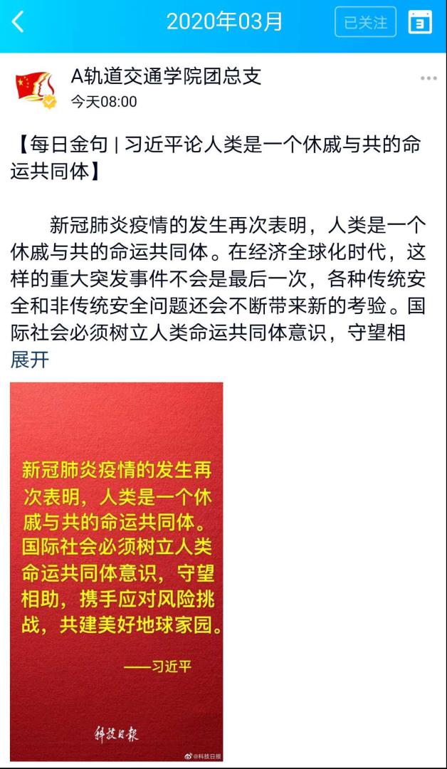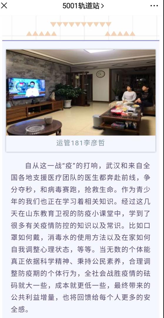 学院微信公众号平台继续在“轨道·战疫”系列专栏,针对疫情防控期间的战“疫”行动及延迟开学期间学生居家的健康生活、学习方式等进行系列报道。本周微信公众号5001轨道站发布推文共3篇,团属媒体阵地太阳集团网tyc9728团总支官方QQ订阅号累计发布疫情相关动态17条。