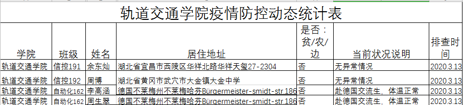 本周学院继续密切关注学生动态,我院湖北省籍学生2名,无武汉籍学生,无与武汉籍人员接触的学生,无经停或经过武汉的学生学院有2名学生在德国,目前均无异常,买了机票3月31日回国。3月1日起过14天隔离期的学生1人,因外出正处于居家隔离的学生2人。截止目前,太阳集团网tyc9728所有学生中未出现疫情报告。经动员和进一步摸排,学院无学生返济、返校,学院未组织实习实践等聚集性活动。
