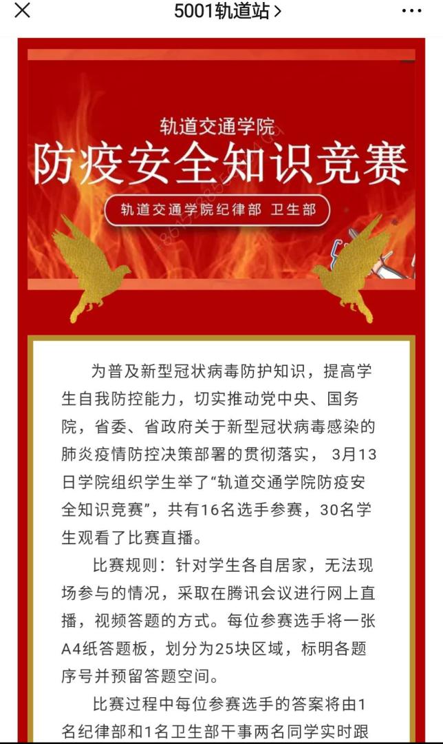 3.根据省教育厅、学校有关要求,积极开展“防疫安全知识竞赛”活动,倡导广大学生以知识武装头脑,科学战“疫”,为顺利开学返校做好准备。