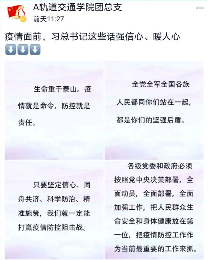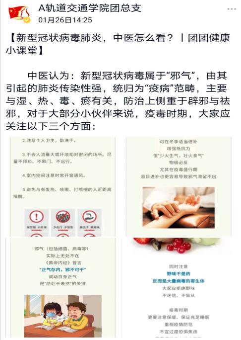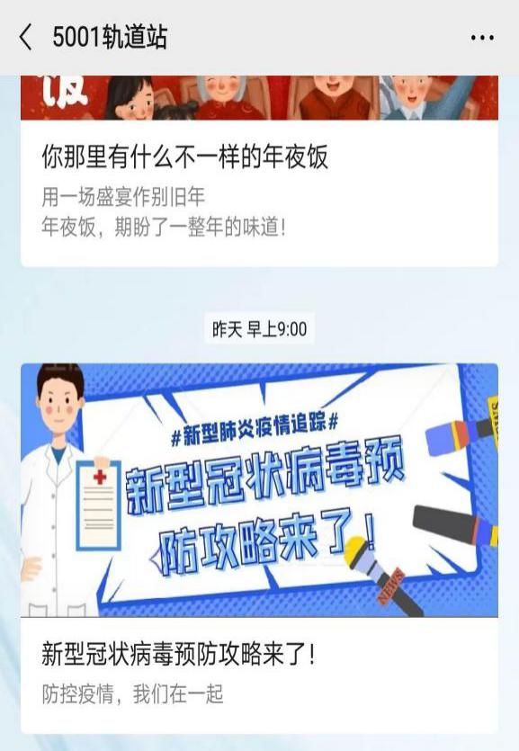 利用学院网络平台微信公众号“5001轨道站”、 QQ订阅号“轨道交通团总支”等网络平台进行新型冠状病毒感染的肺炎防控知识宣传工作。微信公众号本周共发布相关推文2篇:1月30日发布《新型冠状病毒防控攻略来了》,介绍了新型冠状病毒感染的肺炎相关症状、防控措施等;