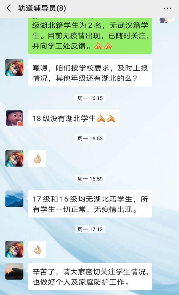 学院按学校党委相关要求,以微信群、QQ群等手段对各年级学生的疫情情况排查工作,各年级辅导员保持每天与学生的密切沟通与联系,做到“日报告、零报告”,第一时间掌控学生疫情信息动态并上报学院和学校。
