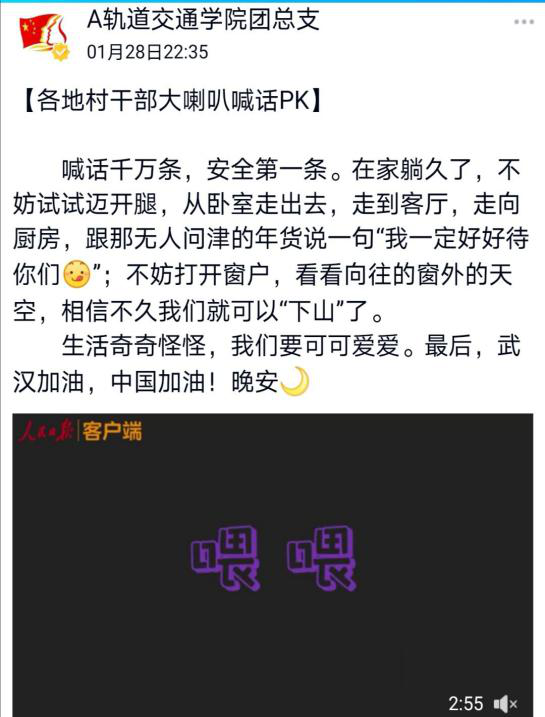 QQ订阅号共发布相关推文3篇:1月26日发布《新型冠状病毒肺炎,中医怎么看?》介绍新型冠状病毒肺炎防控方法;1月28日发布《各地村干部大喇叭喊话大PK》号召大家宅在家,少出行;1月29日发布《疫情面前,习近平总书记这些话强信心、暖人心》及时宣传国家号召,以科学心态面对疫情。