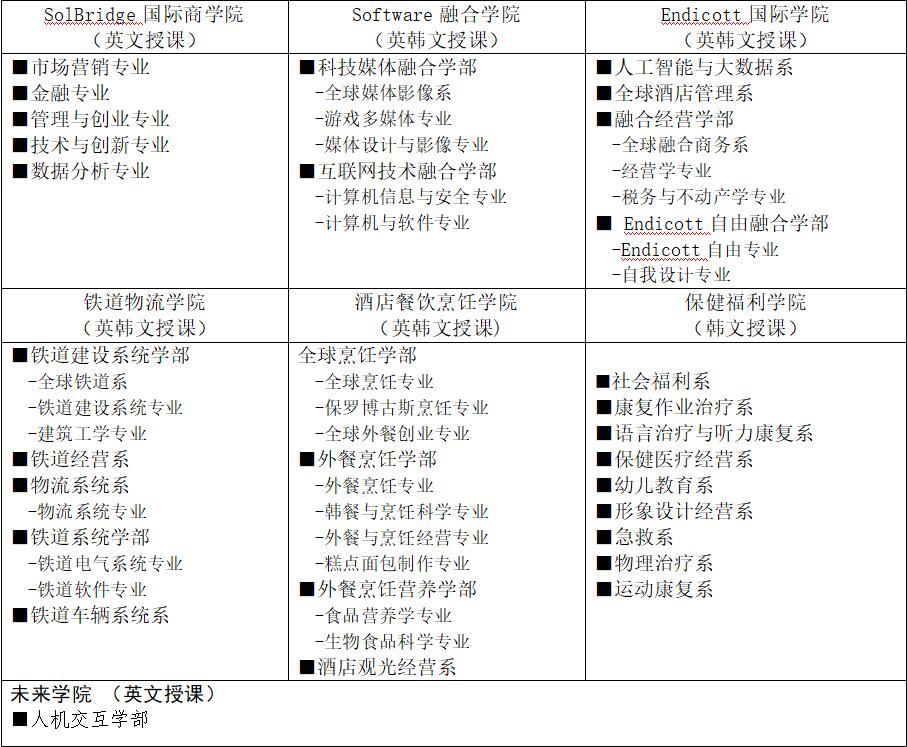 该项目学生入学学习1年后可在韩国又松大学转专业,学生可根据自己兴趣爱好转入计算机信息安全维护、智能IT安全维护、媒体设计影像、游戏多媒体、经营学、税务•不动产学、酒店观光经营、幼儿教育、形象设计经营等专业。