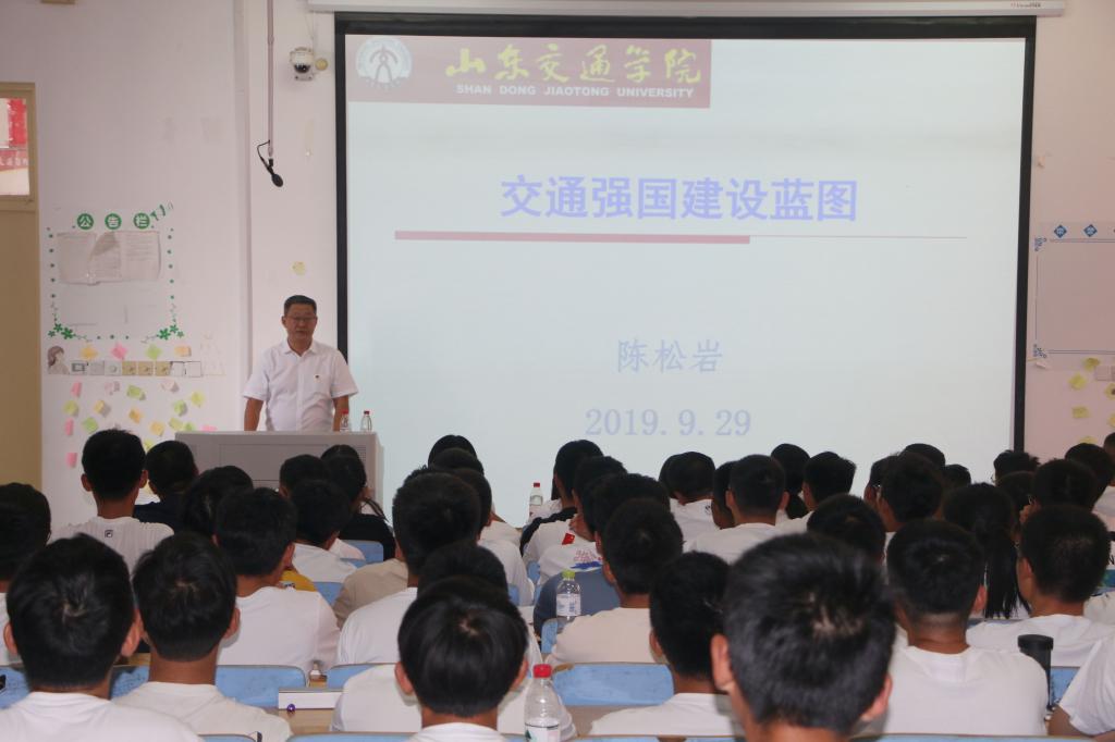 陈松岩院长对《交通强国战略》提出背景、指导思想、发展目标等方面进行解读,重点对基础设施布局完善、立体互联;交通装备先进适用、完美可控及运输服务便捷舒适、经济高效三个方面进行讲解。陈院长思路清晰、语言生动、重点突出、向同学们展现了未来交通发展的一幅幅壮丽画卷,赢得了听课同学的一阵阵热烈掌声。