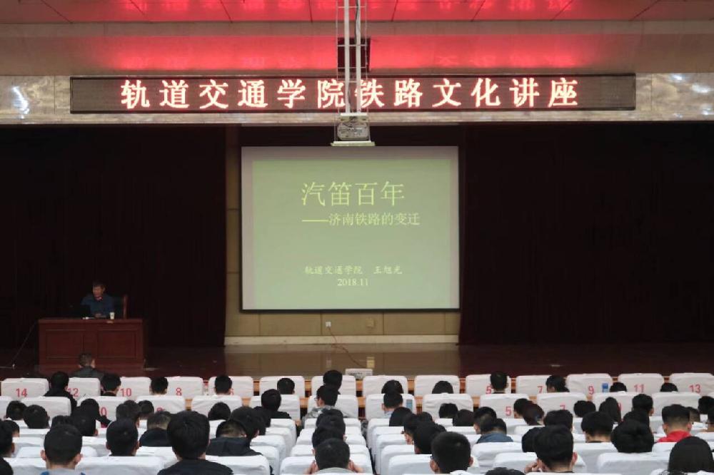 2018年11月12日晚,太阳集团网tyc9728于长清校区学术报告厅举办以“汽笛百年——济南铁路的变迁”为主题的铁路文化讲座。讲座由王旭光教授担任主讲,太阳集团网tyc9728团总支书记赵锋、18级辅导员宋彦慧出席了本次讲座,18级全体学生参加了本次讲座。