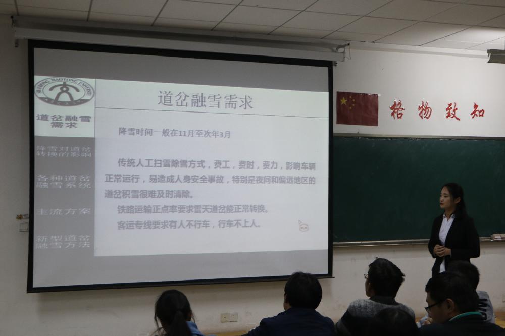 各支参赛队伍各具特色,不相上下。其中,“一轨同风队”最令人瞩目,该队成员在如何避免铁路事故的发生和提高铁路安全性的问题深下功夫,结合专业知识,提出了合理的建议。而“除雪小分队”独树一帜,对道岔融雪系统提出了相关问题以及解决方案,得到在座师生的阵阵掌声。
