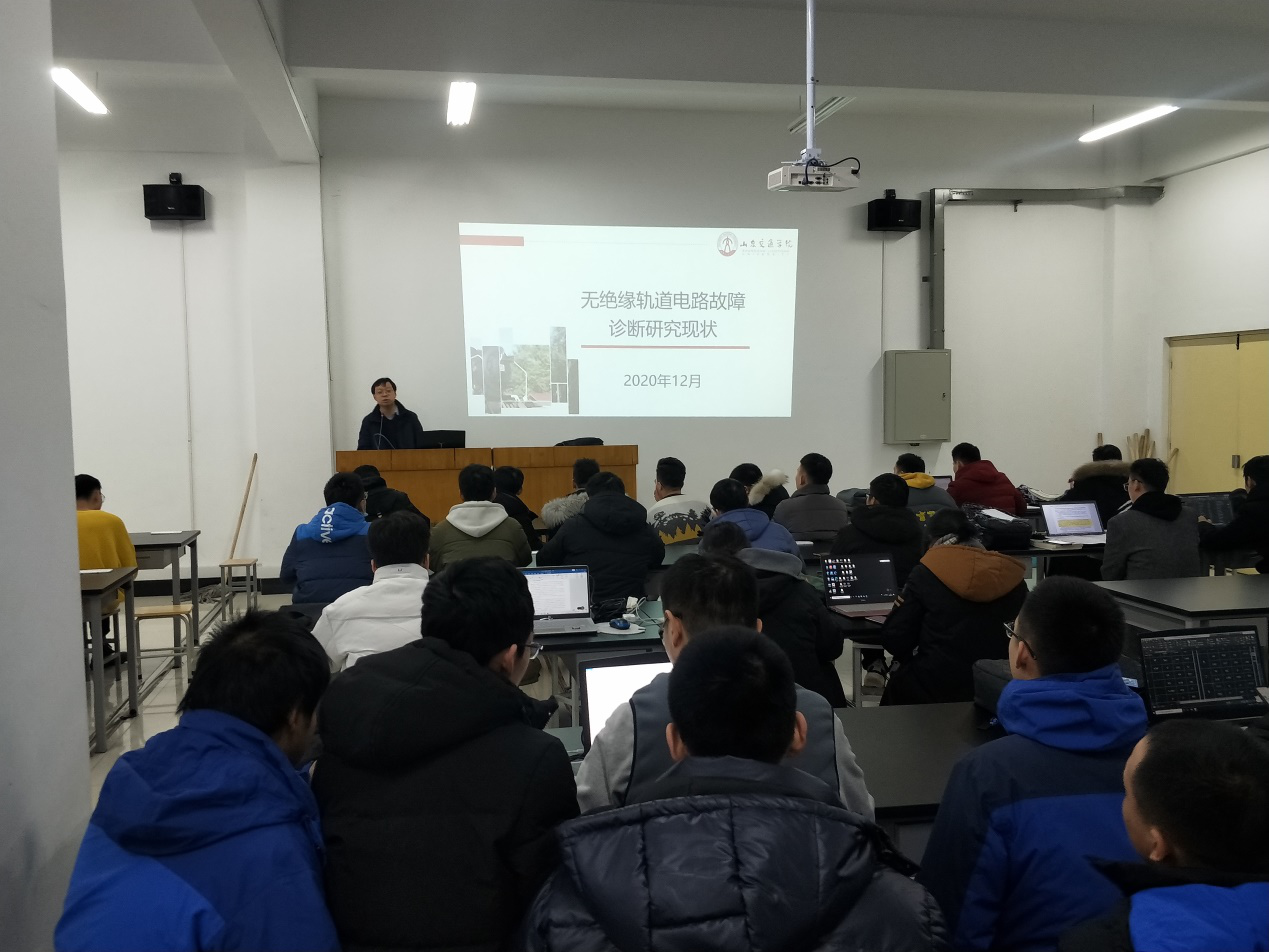 12月30日上午,轨道交通学信控系刘建磊老师为2017级轨道交通信号与控制专业学生做了“无绝缘轨道电路故障诊断研究现状”专题讲座,就无绝缘轨道电路故障诊断的现有技术进行了讲解。