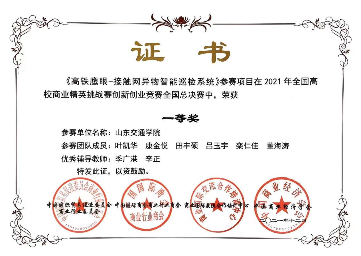 12月2-4日,2021年全国高校商业精英挑战赛创新创业竞赛在广东深圳落下帷幕,我院学生叶凯华负责项目《高铁鹰眼—接触网异物智能巡检系统》荣获国家级一等奖。
